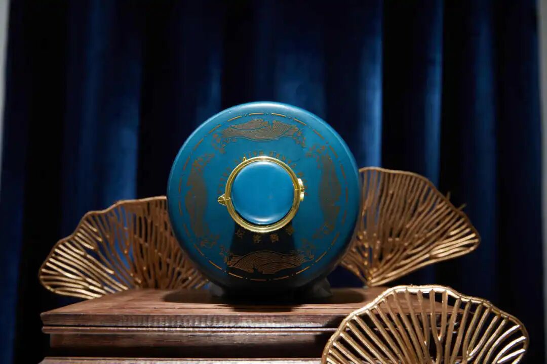 国粹酱香,文化坛客!坛客标品的设计堪称传统美学的现代转译。孔雀蓝的釉色搭配金色纹饰。正面观之,浪花环绕的"坛客"篆印如酱酒奔涌的江河;俯瞰之下,点线交织的圆环构成完美的几何图腾。这种"上善若水任方圆"的造型语言,既暗含"滴滴佳酿汇聚成海"的产业抱负,又寄托着"团圆生生"的东方愿景。浪花既是翻滚的酱酒海洋,又是托举文化的有力臂膀。