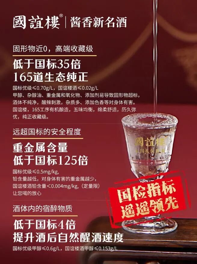 国谊楼以极致匠心严守品质生命线,凭借好原料与精湛工艺,实现品质指标全方位跃升。其质检数据远超国家标准:铅含量低至 0.004mg/kg,甲醇含量≤0.153g/L,固形物近乎为零。从原料筛选到酿造全流程细节把控,以五星品质为消费者呈上安全、纯粹的酱香佳酿,收获市场高度认可与信赖。