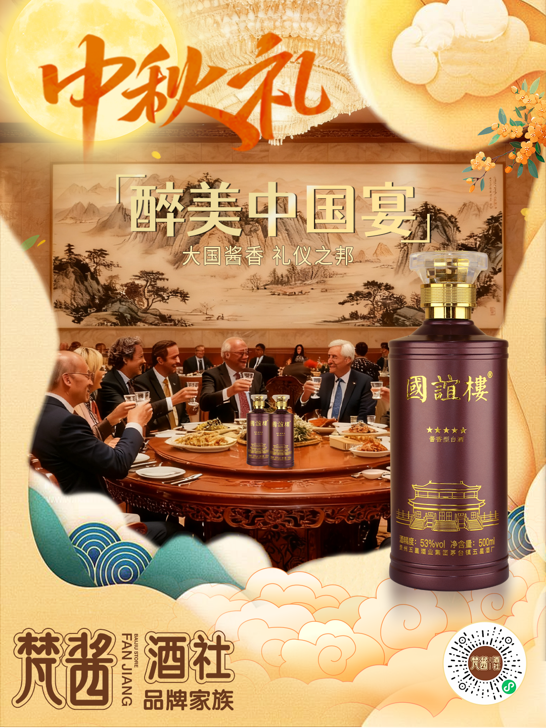 中秋国庆佳节多喜事,宴席用酒需求旺盛。梵酱酒社中的国谊楼·最美中国宴极度适配宴席用酒需求。